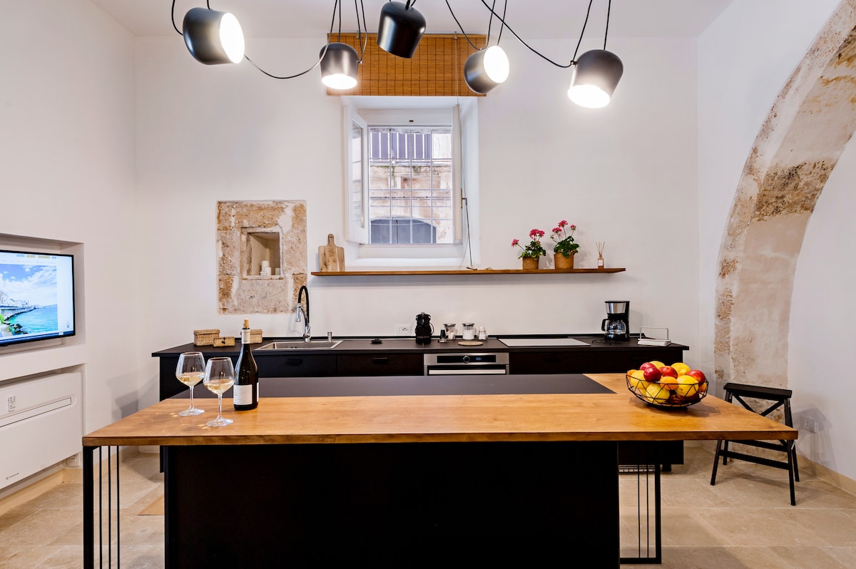 Dionisio 6 es un apartamento elegante, acogedor y cálido en la planta baja, ubicado en el barrio judío de «La Giudecca», en el corazón de Ortigia, a solo 50 metros del mar. Nuestro loft ha sido completamente renovado en 2021 a través de una cuidadosa restauración conservadora utilizando materiales de la más alta calidad con el fin de respetar las características del antiguo edificio en el que se encuentra. La funcionalidad y el diseño se han mezclado con la antigüedad de la estructura arquitectónica.