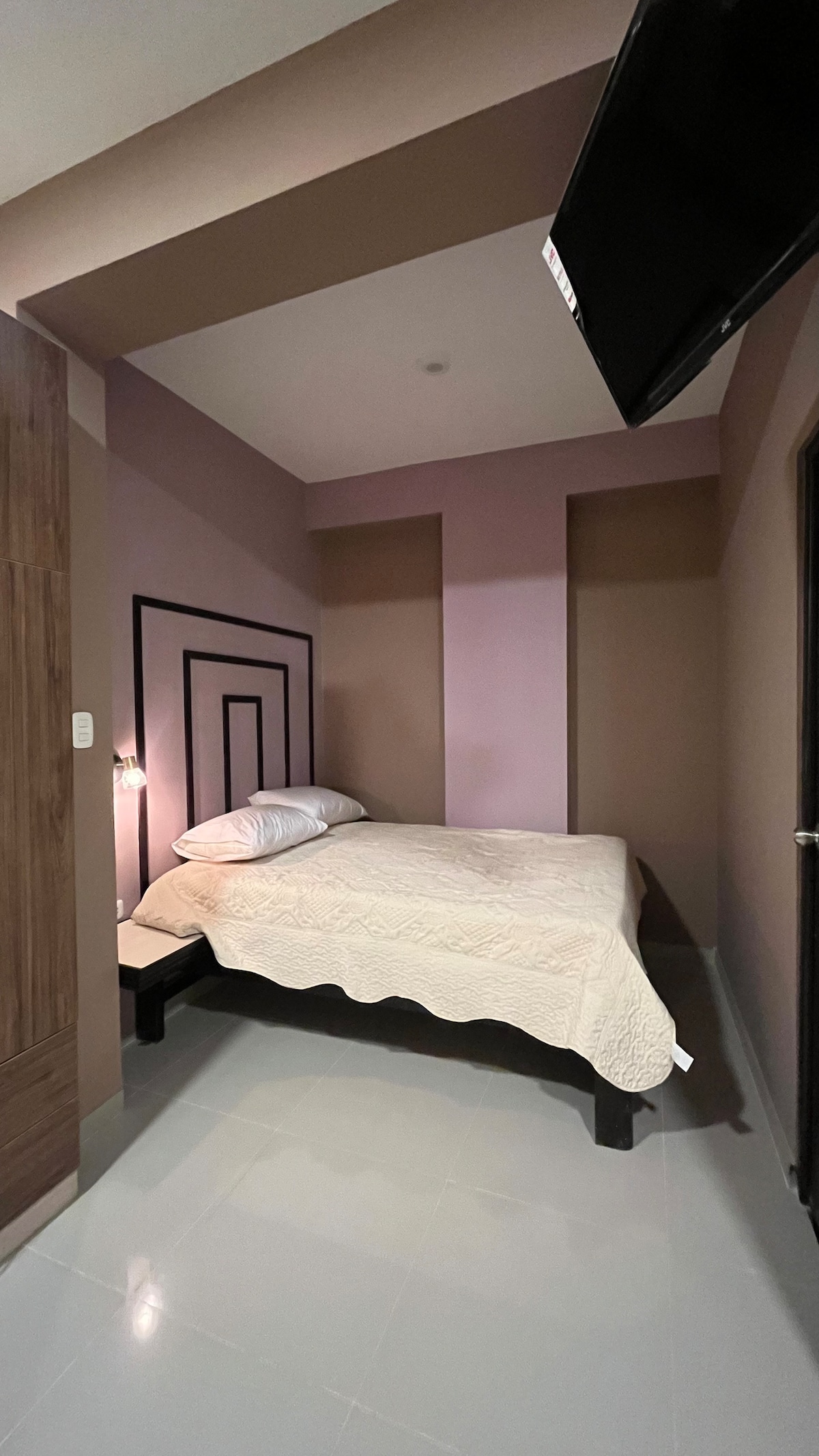 Habitación al interior de una residencia, totalmente acogedora, lejos del ruido de la ciudad, cuenta con lo necesario para un buen descanso. Televisor de 43” Smart conectado al wifi , closet, así como una mesa pequeña con sus dos sillas para trabajo remoto, baño agua fría y caliente. En el lobby tenemos bebidas frías Buscanos como Hotel Palmera verde en Piura