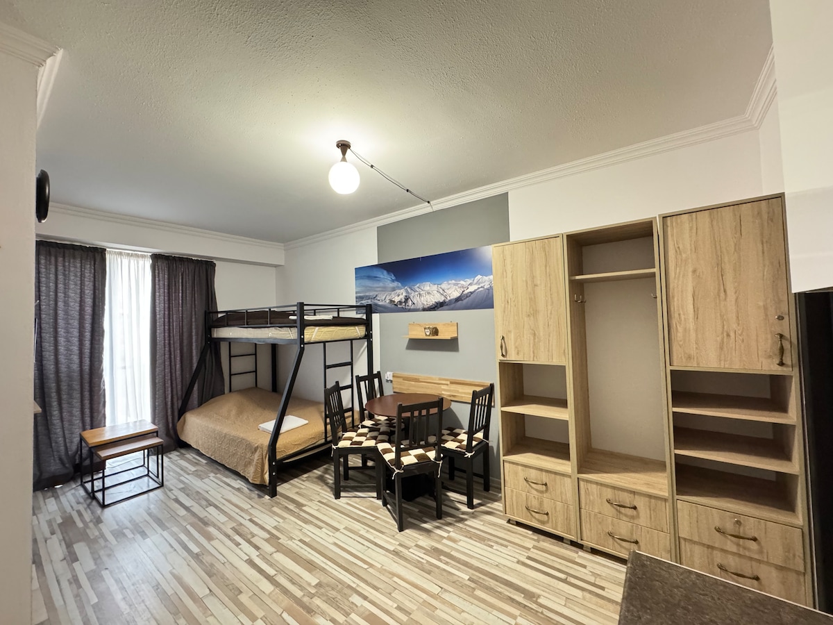 Apartamento tipo estudio en un hotel, bien decorado y amueblado, con espectaculares vistas a la montaña tanto desde el balcón como desde la gran cama tamaño king, para que puedas disfrutar de las espectaculares vistas desde el balcón o desde la cama. Se encuentra en el segundo piso del edificio loft 2 del complejo Redco, en el corazón de New Gudauri, justo al lado del telesilla Gondola. El apartamento tiene un diseño único y una impresionante vista a la montaña desde el balcón. El apartamento tiene una excelente ubicación en el centro para aquellos a los que les gusta el esquí y otros deportes de nieve y montaña.