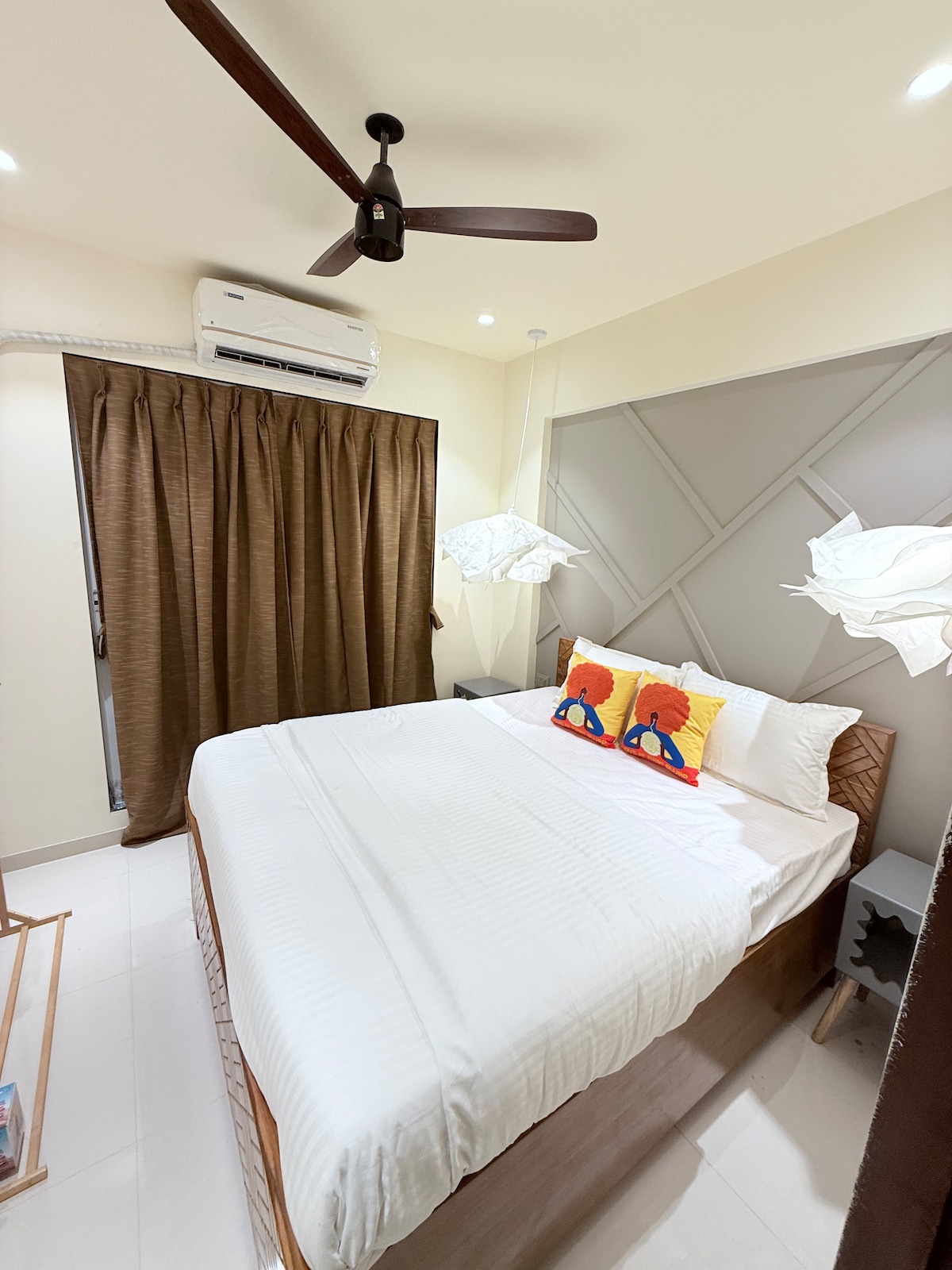 Disfruta de tu estancia en este apartamento de 2 dormitorios en una zona privilegiada. Cada dormitorio tiene aire acondicionado, camas cómodas y armarios. La amplia sala de estar incluye un sofá, una mesa de comedor y un balcón. La cocina ofrece nevera, lavadora, cocina de gas y utensilios básicos, perfectos para estancias cortas o largas. Hay 2 baños: uno adjunto al dormitorio principal con un inodoro occidental y otro cerca del salón con un inodoro de estilo indio. ⚠️ Aire acondicionado disponible solo en los dormitorios; el aire acondicionado de la sala de estar es de pago.