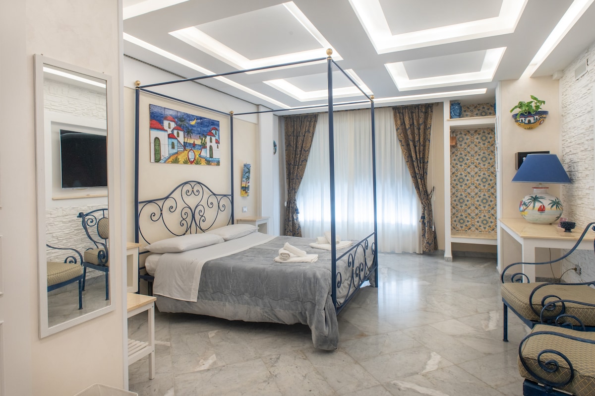 La habitación (100m²) está en el Palacio adyacente al Palazzo Natoli, en la planta baja. La habitación tiene los mismos estándares y comodidades que todas las demás habitaciones del Palazzo Natoli. La habitación familiar es perfecta para estancias largas y es una solución ideal para familias que viajan con niños porque tiene 1 cama tamaño king (200 x 180) y una sala de estar con un sofá cama doble. Y la habitación está equipada con una bañera expuesta y una ducha.