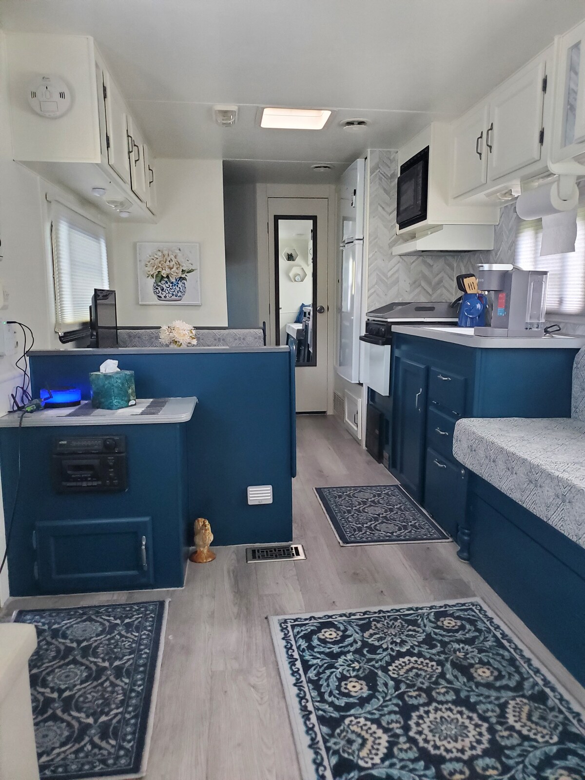 La caravana es una habitación con cama queen y 2 literas. La caravana también tiene un sofá. Las cosas incluidas en la cocina completa son un microondas, una estufa, un horno y una nevera completa. También incluye cafetera, tostadora, ollas y sartenes, utensilios. Hay 1 baño completo en el camper. Proporcionamos una sábana inferior en la cama tamaño queen y las literas. Trae tus propias almohadas, mantas, toallas y lava la ropa. La caravana tiene su propia mesa de pícnic y un anillo de fuego.
