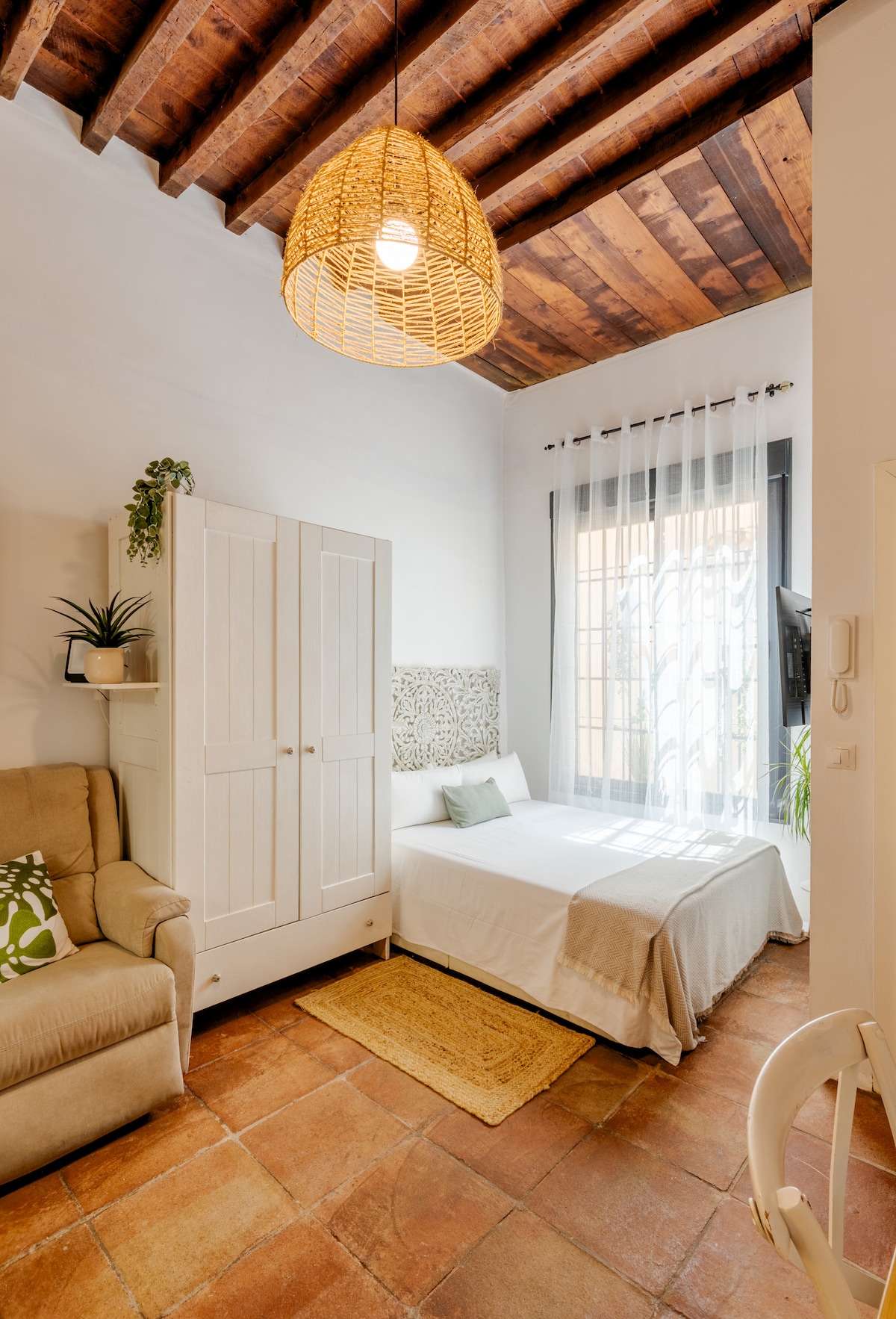 Moderno estudio, silencioso, situado en pleno centro histórico de Málaga, a pocos metros de calle Larios, la Catedral, Museos... El estudio dispone de cocina equipada con nevera, lavadora, vitrocerámica, horno, microondas, cafetera Nespresso, plancha, botiquín, tetera. Baño completo con secador y ducha. Patio privado con sofás al aire libre. Aire acondicionado frío y calefacción, conexión Wifi y televisión. Dejamos 2 toallas por persona(una de ducha y otra de manos) Las camas están hechas.