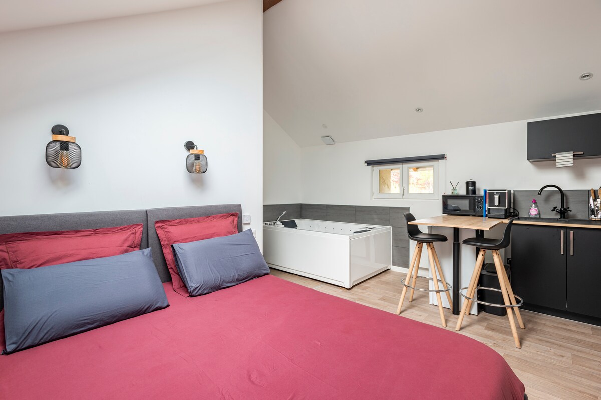 Te damos la bienvenida en nuestro acogedor nido completamente renovado por nosotros. Dormirás en un encantador edificio anexo que se encuentra no muy lejos de nuestra casa (sin pared común). Esta suite está bañada de luz gracias a un gran tragaluz. Apreciarás el lugar, la calma y la serenidad circundante. Serás totalmente independiente con tu plaza de aparcamiento que se encuentra debajo de tu alojamiento. Nuestra balneoterapia es muy agradable con sus chorros de masaje, burbujas y 2 cascadas.