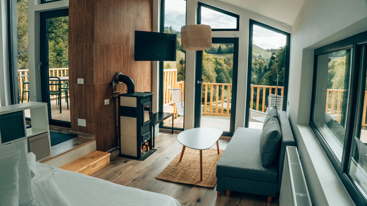 La sala de estar está centrada alrededor de una chimenea de leña, creando una calidez real y un ambiente tranquilo e íntimo para días lentos y noches tranquilas. En el exterior, la naturaleza se asienta en el silencio. Un oasis de paz con bañera de hidromasaje privada bajo el cielo abierto y una piscina rodeada de naturaleza, situada en la cima de una colina con vistas a los Cárpatos y al monte Ciucaș. Construida en estilo tradicional con madera y tejas, la casa de huéspedes es ideal para familias o amigos que buscan una auténtica experiencia transilvana.