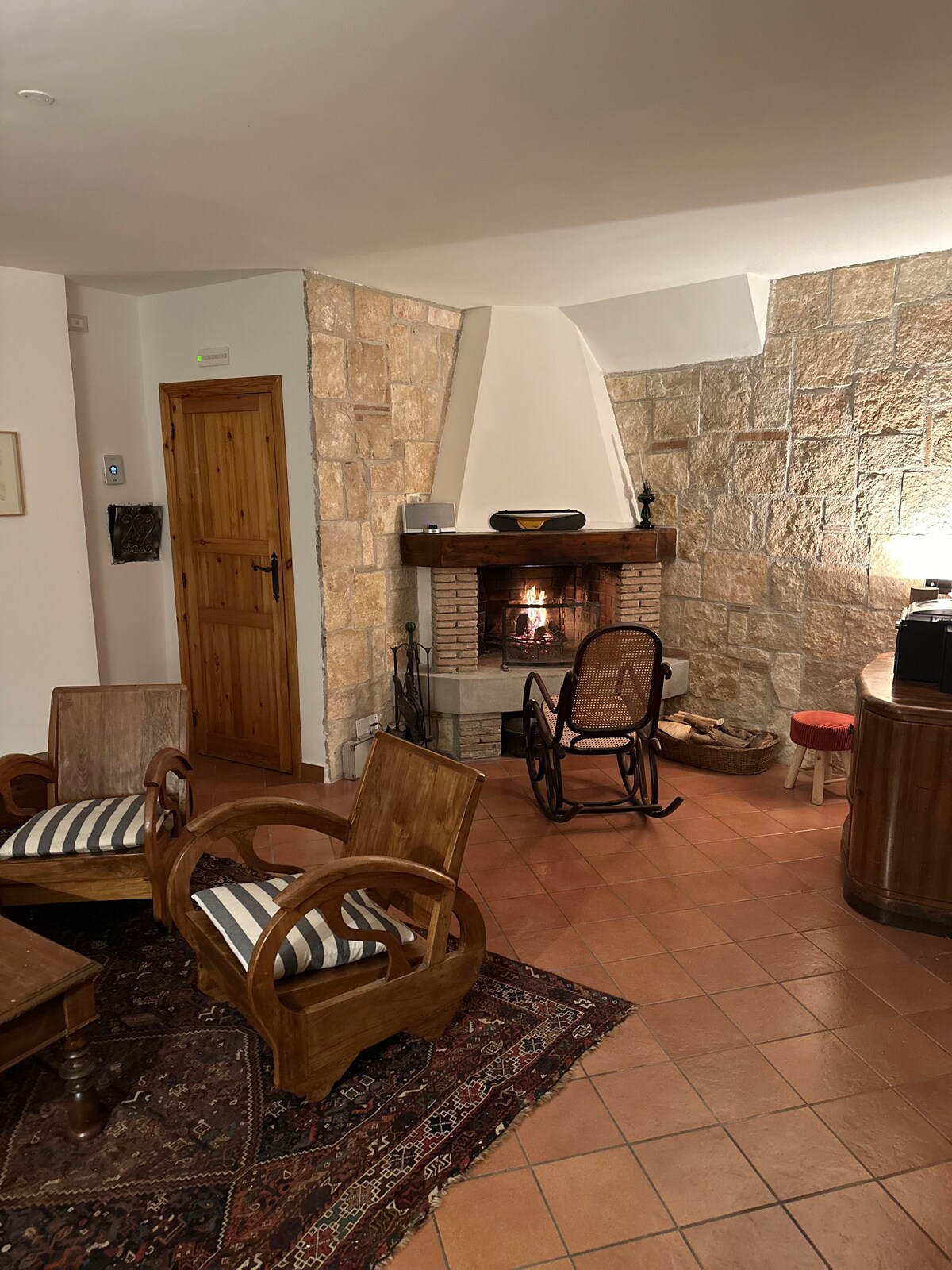 A cottage made up of stone and timber built on two storeys, with a large living room, glass window, a couch for two people and a bathroom with sauna; on the second storey there is a double bedroom. Outdoors, there is a large garden with a porch equipped with BBQ and a wooden table. The site is located on the pleasant hills between Bellegra and Olevano Romano. We have currently added two beds, set up in a wonderful Indian teepe available for two extra guests in addition to the four ones.