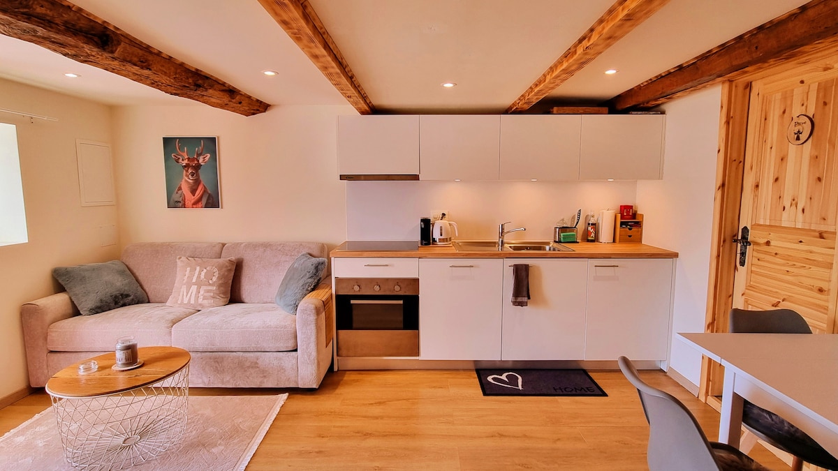 Ubicado sobre el bosque y el río, nuestro luminoso y acogedor chalet se encuentra en una zona tranquila y a pocos pasos de la naturaleza,el río,al comienzo de las rutas de senderismo y a 3 minutos del servicio de transporte(funciona en invierno) Loft ideal para relajarse y descansar junto al fuego de la chimenea o en el jacuzzi. Perfecto para parejas. Para más de 2 personas bajo petición. Dispone de un dormitorio (2 personas) y 1 espacio abierto bajo el altillo con TV y cómodo sofá cama.