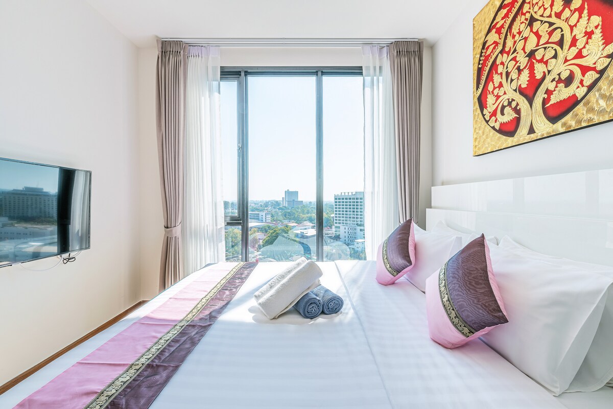 Este nuevo y lujoso condominio se encuentra en el corazón de Chiang Mai, cerca del popular Night Bazaar. El aeropuerto está a solo 15 minutos. Puedo organizar el transporte desde el aeropuerto si es necesario. Este apartamento es muy cómodo con una cama de matrimonio grande y un sofá cama en el salón. La cocina está completamente equipada para aquellos que les gusta comer en casa. Hay un lujoso baño con bañera de hidromasaje y ducha independiente. El inodoro está en una habitación contigua separada. Gimnasio, alberca, sauna en el último piso.