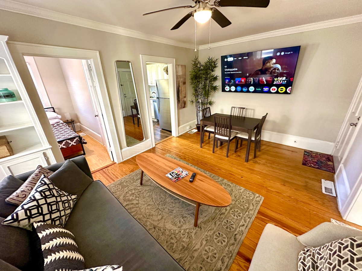 Disfruta de tu película favorita en un televisor de alta definición de 42 pulgadas mientras cocinas en una cocina con encimeras de madera y granito personalizadas. También hay una estación de trabajo apta para portátiles, además de 3 televisores inteligentes adicionales en otros lugares. El baño cuenta con mármol de Carrara y azulejos blancos. Disfruta de la planta abierta recién remodelada de nuestra casa, el patio trasero vallado para mayor privacidad, el porche cubierto, el patio, el estacionamiento privado y todas sus comodidades modernas. Aprovecha el cómodo acceso a la Greenway o acomódate para ver una película en uno de los 3 televisores inteligentes de alta definición. Puedes transmitir tus películas favoritas mientras preparas la cena en nuestra bien equipada cocina o aprovechar la proximidad al mejor restaurante vietnamita de Charlotte, Lang Van. Registro de entrada fácil con el teclado. Estoy disponible por teléfono, mensaje de texto, correo electrónico o timbre. Consulta el libro del anfitrión para obtener recomendaciones de lugares para comer, con mucho para elegir en NoDa y Plaza-Midwood, cada uno a unas 3 millas de distancia. Ve espectáculos y eventos deportivos en el Auditorio Ovens y el Coliseo Bojangles, con la parte alta de la ciudad a solo 5 millas.