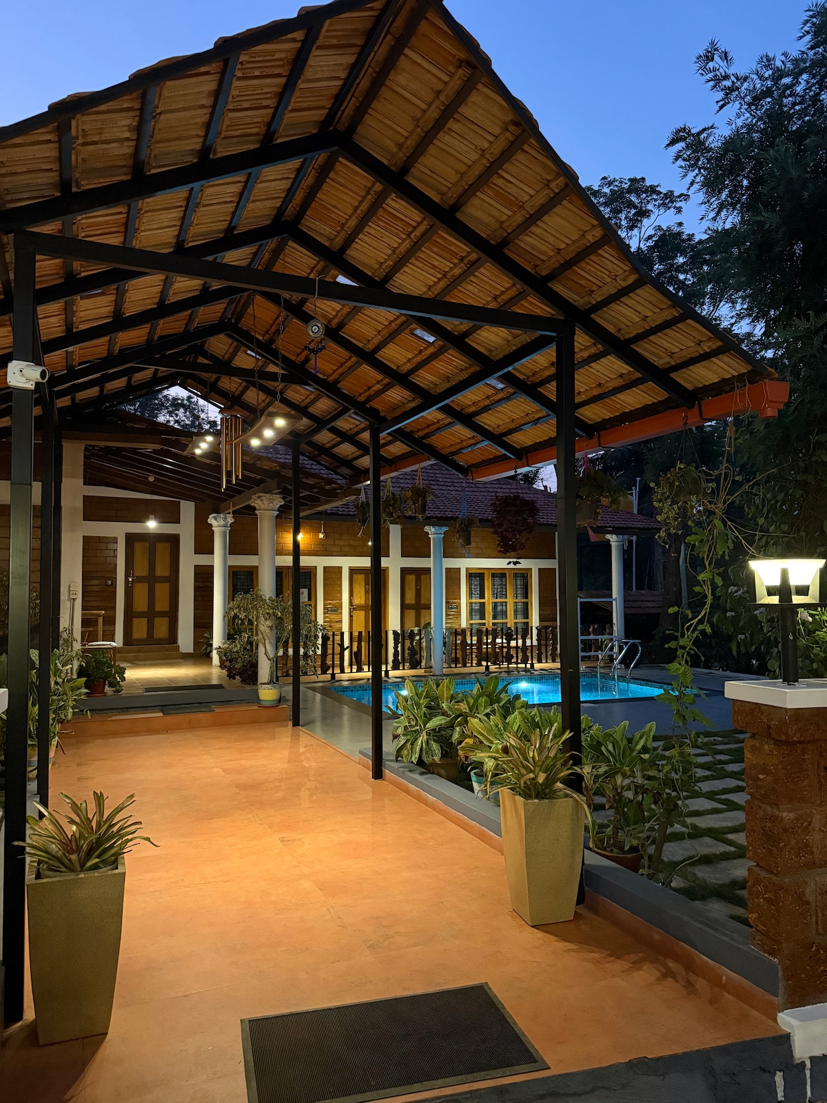 Una villa de granja junto al río enclavada en medio de una exuberante granja verde, The Palavayal Farm Villa es una escapada perfecta para un retiro completo en la naturaleza. El río Tejaswini fluye a través de la propiedad, dando a nuestros huéspedes acceso privado exclusivo al río. Los huéspedes también pueden relajarse en nuestra gran piscina de 12x6 m. Nuestros huéspedes disfrutan de rafting, kayak, paseos por el río/la granja y paseos en casa flotante. Ideal para aquellos que quieran alejarse de la ciudad y pasar tiempo de calidad con familiares y amigos en medio de la naturaleza.