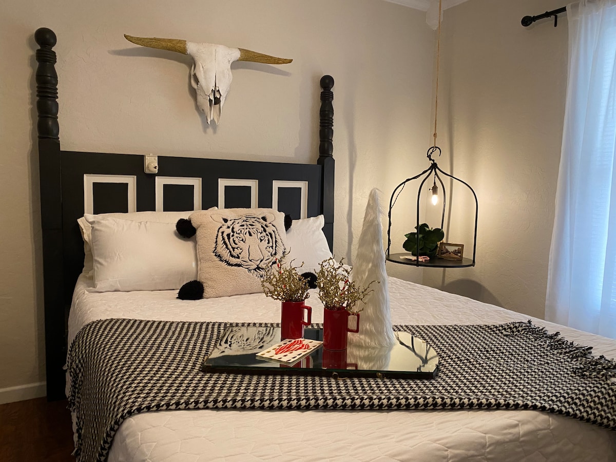 Esta casa privada de 1 dormitorio y 1 baño fue originalmente una histórica gasolinera Sinclair. Renovado en 2023, hemos conservado la mayor cantidad posible de elementos del edificio original mientras lo restauramos para crear una experiencia única y relajante. El área de la bahía se ha convertido en un espacio para vivir y dormir que incluye un televisor y una zona de estar, así como dos camas tamaño queen y un sofá cama. El antiguo espacio de oficinas ahora cuenta con una cocina completa. Un patio trasero, chimenea, lavadora y secadora se encuentran en el sitio.