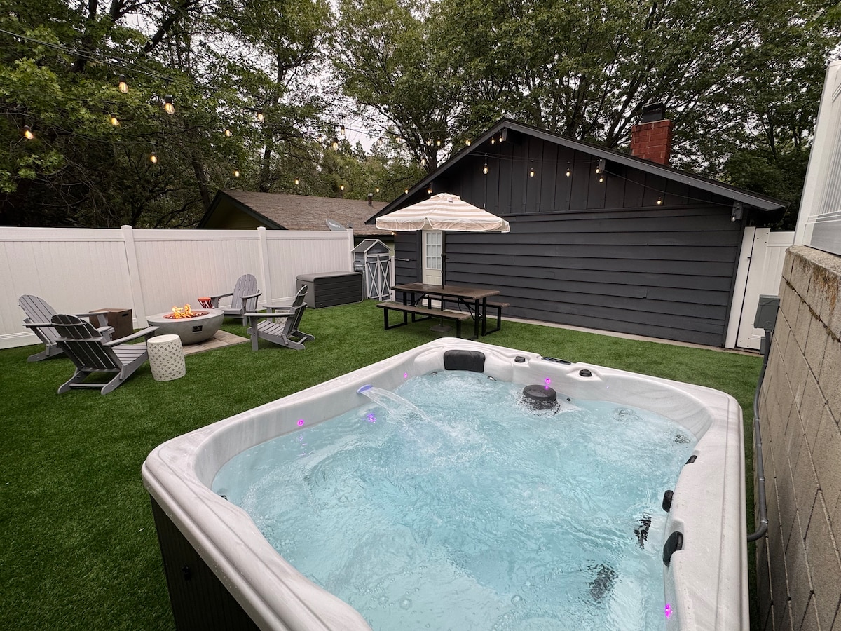 ¡Te damos la bienvenida a Little Bearfoot Cabin! Una cabaña de 1925 de una sola planta con servicios modernos de spa y una oficina independiente con wifi rápido para nómadas digitales. Ambiente de campamento de verano de lujo. Acurrúcate junto a la hoguera para hacer s'mores, disfruta de cenas al aire libre y relájate en el jacuzzi bajo los altos árboles de hoja perenne. Si no estás al aire libre en el increíble patio, disfruta del aire acondicionado/calefacción central. A menos de una milla del lago, el pueblo y la cervecería Lake Arrowhead. Acceso para caminar por los senderos privados. Se admiten perros y niños. Cargador para vehículos eléctricos