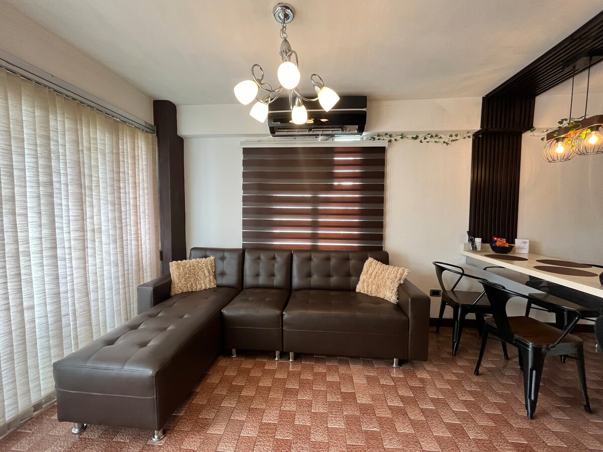 Este lugar único tiene su propio estilo moderno a solo 5 minutos a pie de la bella bahía de cata .El apartamento tiene dos habitaciones privada con cama matrimonial y una tenie un vestier y en la sala tiene un sofá . Tiene aire acondicionado y wifi . La cocina está equipada con lo básico en utensilios y artefactos . Cuenta con sala y comedor con 6 sillas . 1 baño completo con agua caliente . El complejo cuenta con piscina y , parrilleras y para que infantiles. Seguridad privada las 24 horas .