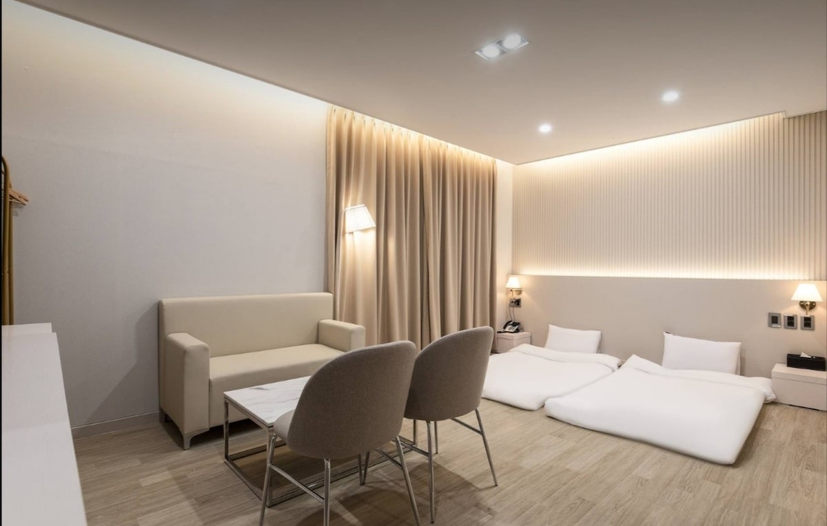 🏡[Hotel Bella] 20 📍City Hall-gil, Chuncheon-si, Bela City, Chuncheon. 🚗estacionamiento Registro de aparcamiento gratuito disponible. Se requiere el número completo de la matrícula Configuración de la🛏️ habitación Cama tamaño queen que sea cómoda para una pareja o una estancia más larga. La ropa de cama se cambia incondicionalmente cuando se hace el mantenimiento de la habitación Servicios de🍽️ cocina Proporciona vajilla y platos para el número de personas (X adicionales) Estufa de inducción, nevera 🛏️Servicios: 1 litro de agua mineral (2 botellas por noche) Toallas (se proporcionan 4 por noche). No lavar las → toallas. Jabón de manos, espuma limpiadora, jabón, toalla de ducha Lavado corporal, champú, acondicionador, secadora de pelo Pasta de dientes, tocador 📶Instalaciones 🌐 Wifi (Internet ilimitado y de alta velocidad) 📺 Android TV/Netflix disponible (※ Solo se proporciona la plataforma) 🕓Horario de uso Llegada: 16:00 (no presencial) Registro de salida: 11:59 Servicios 🛍️cercanos Tienda de comestibles: alrededor de 20 m Estación de Chuncheon, Legoland: 5 minutos en coche A 5 minutos a pie de: Bancos, centros comerciales subterráneos, tiendas (Brown 5th Street), mercado tradicional, calle de las costillas de pollo. 🍽️Restaurantes y lugares de interés recomendados Podemos recomendarte restaurantes locales y rutas turísticas. Ruido generado durante eventos frente al ayuntamiento.