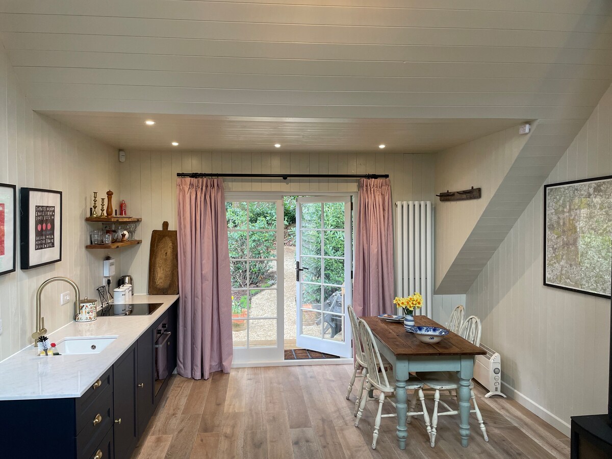 Escápate a nuestra aislada y única casa pequeña ubicada en un bosque privado, con una bañera al aire libre con vistas a campos tranquilos. Disfruta de una vida luminosa y abierta con una estufa de leña, un proyector y una lujosa ducha de efecto lluvia. Perfectamente ubicado a pocos pasos de Weyhill y de la encantadora ciudad comercial de Haslemere con su estación de tren. A poca distancia en coche de la A3, Goodwood, Devil's Punchbowl y un sinfín de rutas de senderismo y ciclismo. ¡Una escapada tranquila te espera!
