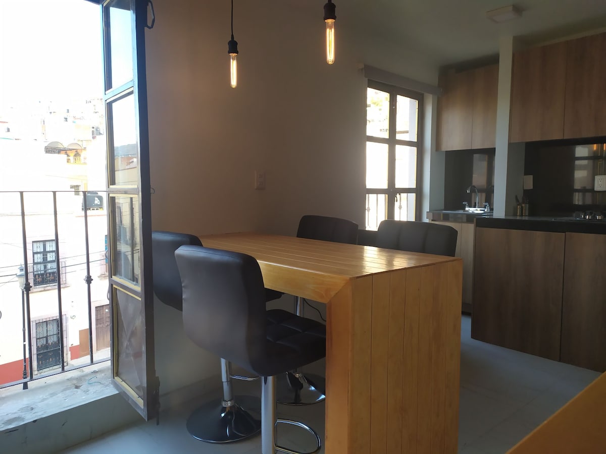 Pequeño apartamento ubicado justo en el centro histórico de Zacatecas Estudio con cama King Size y sofá cama matrimonial Además cocina (estufa,refrigerado, cafetera, microondas , utensilios de preparación y condimentos básicos), espacio con comedor con cuatro sillas y baño completo Balcón en donde puedes disfrutar de las tradicionales callejoneadas Wifi SmarTV 55 Netflix Secadora de cabello Baño con Agua caliente shampoo body washtoallas