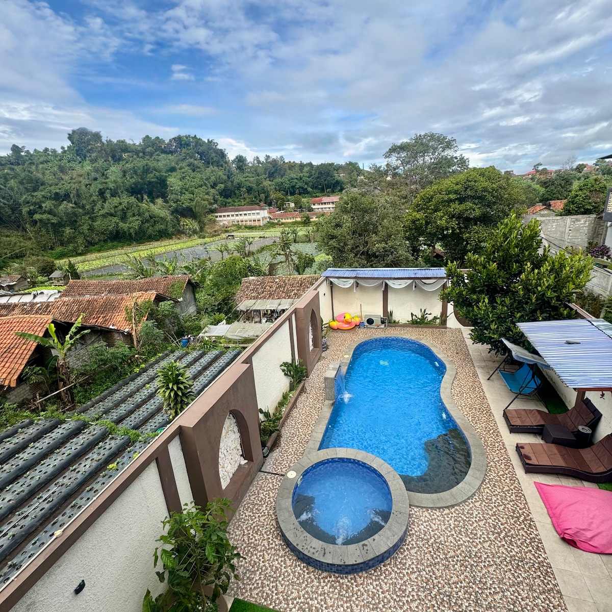 Villa privada, hermosos paisajes durante todo el día hasta la noche, el aire es limpio y fresco. La acogedora zona del balcón es perfecta para charlar y hacer una barbacoa. Piscina infinita privada y azotea disponibles con excelentes vistas. Una villa con un ambiente impresionante, con instalaciones de entretenimiento (billar y karaoke), cerca de donde las cafeterías más populares de la ciudad de Bandung para los huéspedes que viven con niños pequeños, ofrecemos una zona de juegos para tu querido bebé, para que se unan a disfrutar felizmente de tus vacaciones en casa.