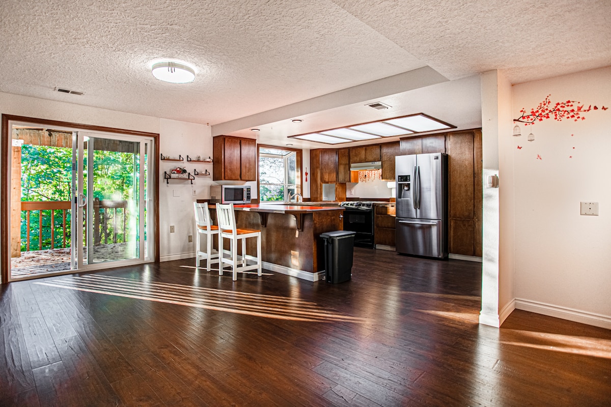 Escápate a The Mountain Lodge, un refugio totalmente remodelado de 5 camas y 3 baños con una pista deportiva cubierta (pickleball/bádminton/voleibol) en 2 acres, a solo 20 minutos de los resorts del monte Hood. Este refugio de 306 m², que admite mascotas, tiene capacidad para 16 personas. Chimeneas acogedoras, cocina gourmet y encanto moderno. Disfruta de una sala de juegos/teatro, TV Roku de 75 pulgadas, jacuzzi y chimenea. Con wifi, carga para vehículos eléctricos y amplio aparcamiento, crea momentos inolvidables durante todo el año. ¡Reserva hoy mismo tu escapada a la montaña! (La sala de teatro tiene un colchón inflable tamaño king de lujo)