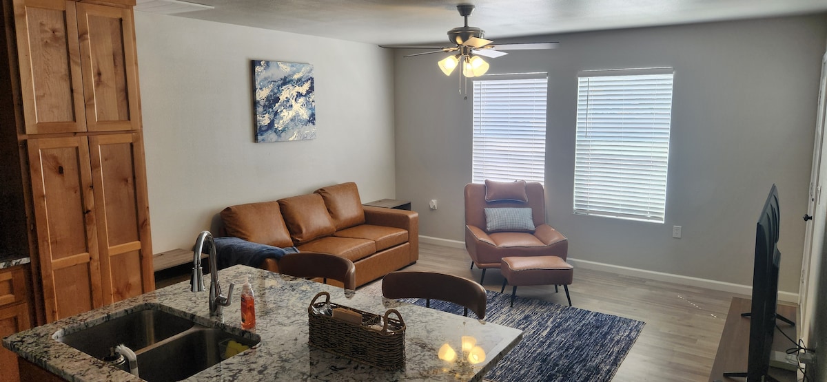 ¡Disfruta de una nueva construcción! Adivino 2 cama (1 reina + 1 rey). baño de 2 baños (Maestro con baño en suite+sal). Lavadora/conductor. Ganar granito a través de fuera. Pantería de la despensa. Todos los cubiertos, platos para servir, utensilios, microondas, horno de tostadora, cafetera, preparación de alimentos y ollas-n-pans incluidos. patio trasero con parrilla de propano. en Fiberóptica WiFi. en Smart TV.