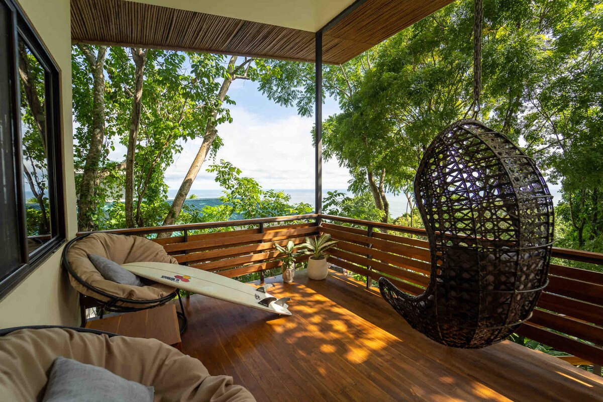 Modern, affordable treetop villa with incredible ocean and coastline views. Perfect for couples seeking a romantic adventure retreat. Enjoy a full kitchen and large private balcony, ideal for morning coffee, birdwatching, and checking the waves below. Located just 1 km above the famous beaches of Santa Teresa and Playa Carmen. Private, peaceful, and equipped with very fast Wi-Fi for when you need to connect. Your elevated escape awaits!