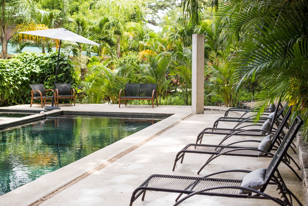 Esta elegante casa con estructura en A es única. Se encuentra en el corazón de la exuberante selva de Malpaís. Desde un café por la mañana en nuestra terraza suspendida escuchando el río y la naturaleza hasta tomar una copa de vino en nuestro jacuzzi al aire libre, te sentirás uno con este oasis mágico. Perfectamente ubicada para aquellos que quieran estar cerca de la acción, pero lo suficientemente lejos como para disfrutar de la naturaleza. A solo unos minutos en coche de todas las tiendas/restaurantes de la ciudad y a solo unos minutos a pie de la playa más cercana para tomar unas copas al atardecer.