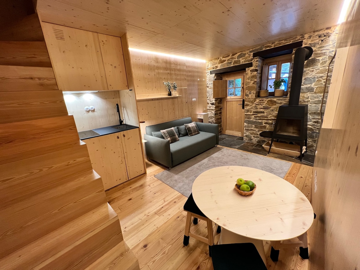 Relájese en este alojamiento único y tranquilo, Tiene 2 dormitorios con cama doble más sofá cama, baño con ducha, sala de estar y cocina... En el exterior hay un jardín con césped natural y una barbacoa... También tiene un espacio de ocio en una plataforma en cubierta para escuchar el río correr con un paisaje muy bonito...