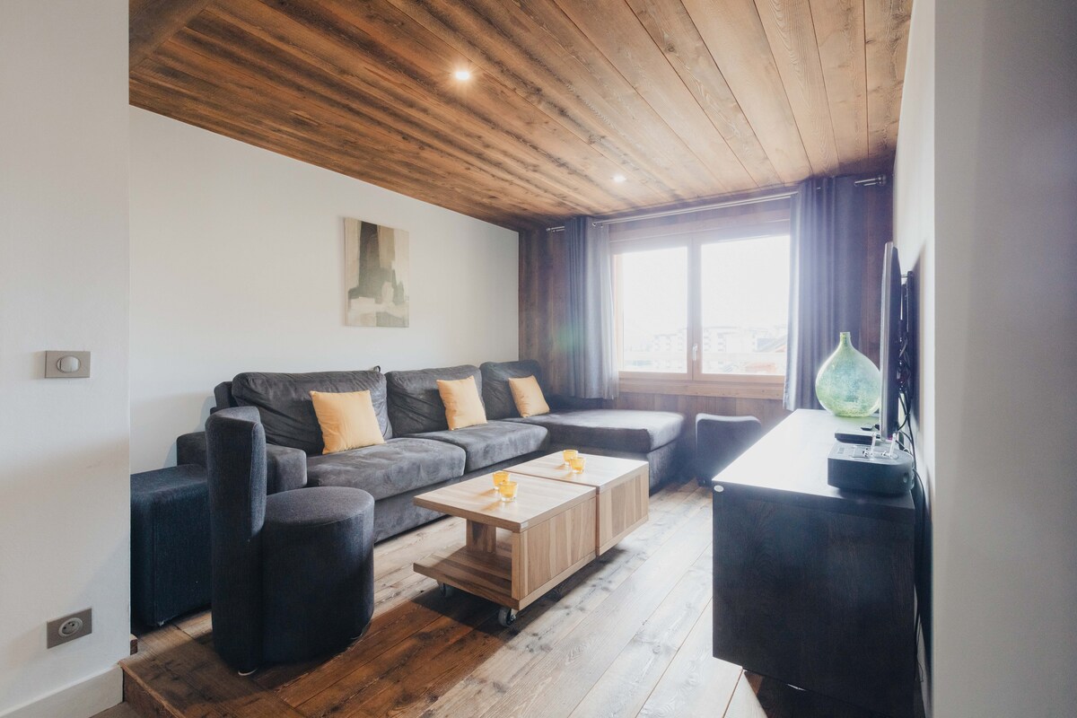 En la planta baja, apartamento de 55 m2, orientación sur, amueblado en un estilo a la vez moderno y de montaña. Vistas a las cumbres. Amplia sala de estar con sofá, TV de 127 cm. 2 dormitorios con camas de 160 cm, grandes armarios y roperos. Una habitación con TV. Terraza y jardín de 60 m2. Para su comodidad, además de los equipos básicos, encontrará hervidor de agua, tostadora, aparato de raclette/parrilla/crepera, aparato de sándwich/gofres...La limpieza al final de la estancia está incluida.