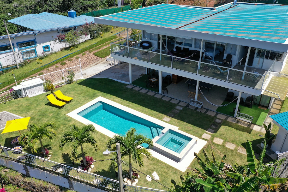 Check in 9a.m Check out 5p.m. Relájate con toda la familia y amigos en esta acogedora casa de Campo, contamos con piscina Climatizada, terraza techada de 100 mts para que celebres tus ocasiones especiales (maquina de hielo incluida) y una persona(no es obligatorio) a su disposición en el día para limpieza y los asista en todo lo necesario para que su estancia sea agradable e inolvidable, donde la tranquilidad se respira, entre senderos, ríos y miradores, mucha flora, fauna, 1 hora de la Ciudad.
