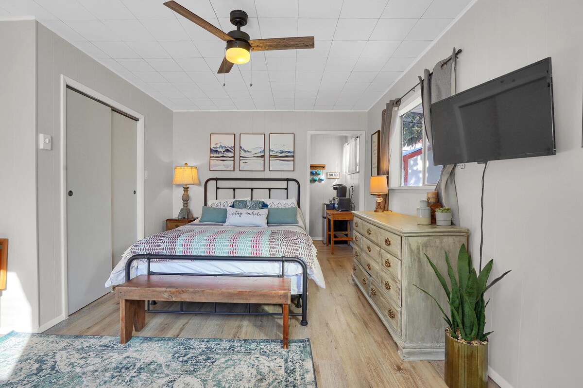 Apartamento tipo estudio de 350 pies cuadrados en la parte trasera de una casa privada. Entrada privada. Paredes compartidas con la casa. La entrada está debajo de una gran plataforma superior. El patio fuera de la unidad está reservado para el uso de los huéspedes y ofrece espacio adicional para relajarse con una parrilla de gas y un fogón. Cocina equipada con microondas, horno tostador, licuadora, tostadora, placa calefactora, ollas y sartenes, cafetera de 12 tazas, platos, etc. Baño privado con spa como ducha, lavadora y secadora en la unidad.