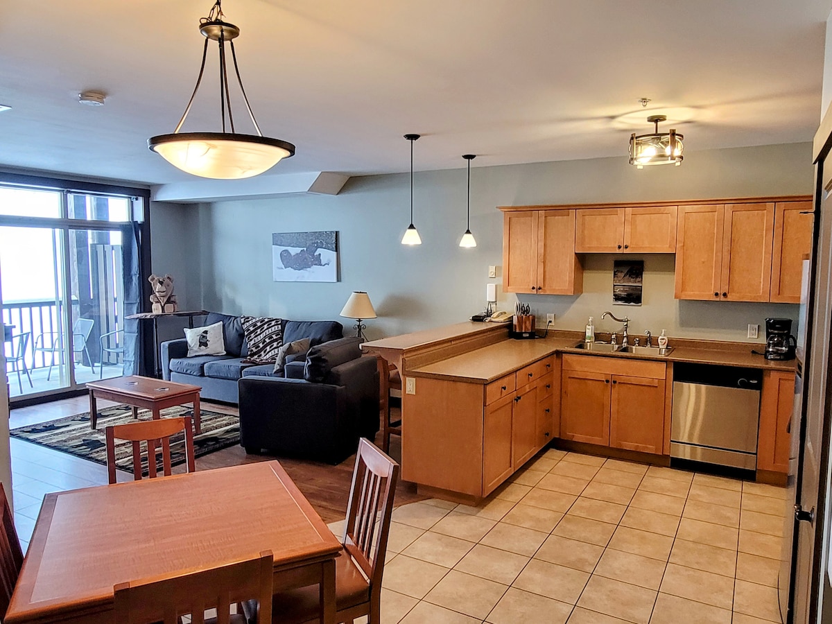 Este apartamento de dos dormitorios y dos baños cuenta con una bañera de hidromasaje y un sofá cama tamaño queen, con capacidad para 6 personas. Es una unidad de esquina en el segundo piso con vistas a la estación de esquí, el campo de golf y los espectaculares picos de las montañas circundantes. Lo que hace que esta unidad sea única es que cuenta con obras de arte de varios artistas locales. A pocos minutos del centro vacacional y a poca distancia en coche del centro de la ciudad, este apartamento está idealmente ubicado.