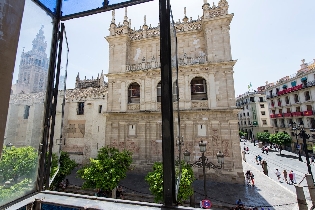 El alojamiento 145 m2 está en el corazón de Sevilla, con unas vistas impresionantes, pegado a la Catedral y la Giralda. Se encuentra en el emblemático entorno Catedral-Giralda-Reales Alcázares-Archivo de Indias, a 5 min de La Maestranza y a 1 min. del ayuntamiento. Además está también junto a la entrada al pintoresco barrio de Santa Cruz. Finalmente cuenta con la zona comercial más importante de Sevilla, calle Sierpes y Tetuán entre otras, además de bares de tapas y restaurantes.