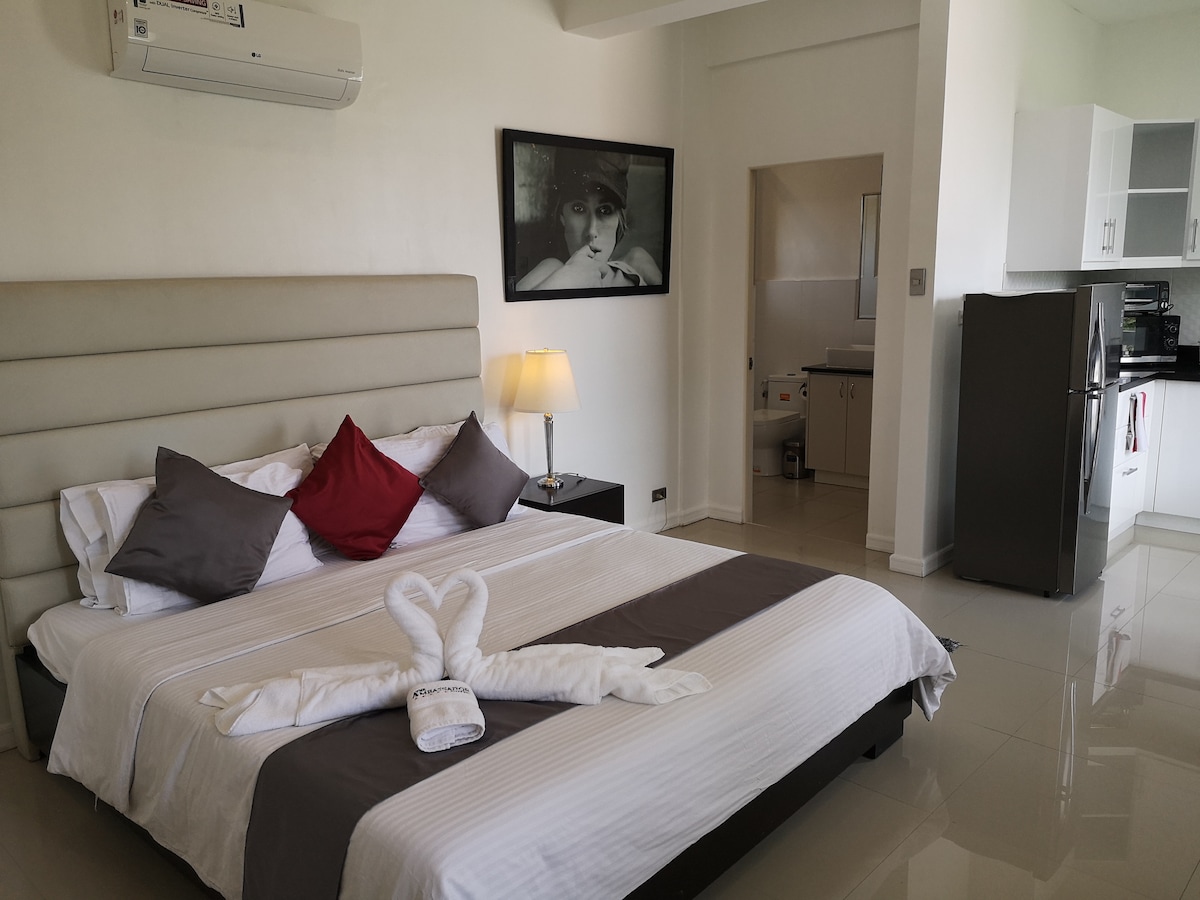 Apartamento ubicado dentro del Luxury Penthouse Hotel. La unidad está ubicada en el noveno piso y está lujosamente decorada con muebles exquisitos, iluminación ambiental, cama tamaño king, ducha de efecto lluvia, nevera de tamaño completo, fogones, agua potable gratuita, aire acondicionado, sonido envolvente, reproductor de DVD, TV por cable de pantalla grande de 55 pulgadas y wifi. El hotel también cuenta con un generador, por lo que nunca te quedarás sin electricidad.