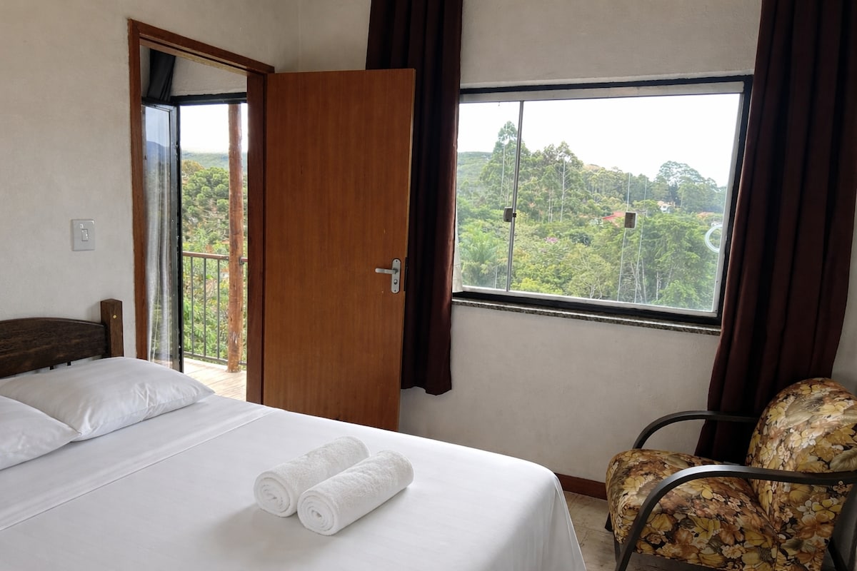 Chalé con increíbles vistas y ambiente, está dentro del Recanto Serra do Trovão en Chapada de Lavras Novas (a 7 km del centro de Lavras Novas y a 17 km del centro de Ouro Preto). El alojamiento, que ofrece total comodidad y privacidad, incluye un dormitorio, un baño y una cocina totalmente equipada (fogones, mininevera y utensilios básicos). Recanto es una zona cerrada con 7 chalets para alquileres de temporada, tanto por separado como para grupos cerrados.