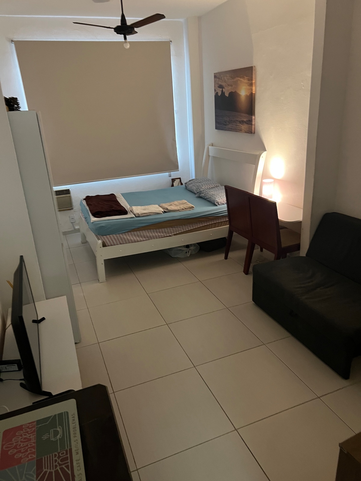 Apartamento quarto e sala super amplo, em excelente localização, na avenida principal de Copacabana, posto 5, com tudo 24hs ao redor. No enorme quarto de casal, além de uma cama de casal, tem ainda um sofá cama grande, guarda roupas e uma smart TV de 55” e um ar condicionado potente, que gela todo o apartamento. Na sala, há duas beliches, o fazendo muito versátil, capaz de atender bem até uma família. Todos os colchões são novos, molas ensacadas e o enxoval de qualidade. Tudo muito bem lavado!