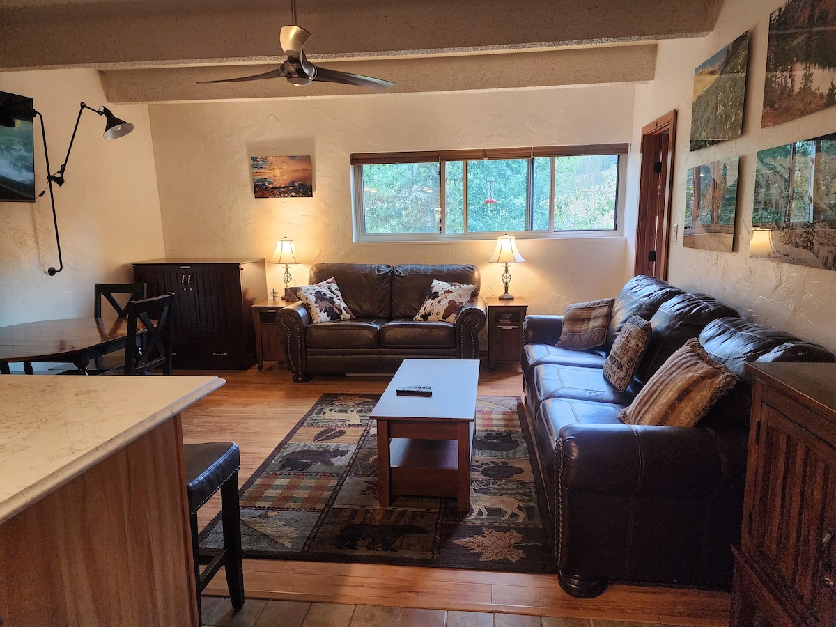 Aparcamiento cubierto gratuito e internet de alta velocidad. Apartamento de 890 pies cuadrados con balcón privado con vistas a Tenmile Creek y ubicado en Mt. Royal. Disfruta de una cocina totalmente equipada, chimenea de gas, balcón, Netflix/TV inteligente. ¡El autobús se detiene directamente en la parte delantera y te deja en Copper Mnt en 7 minutos! Ubicado en el centro, cerca de múltiples estaciones de esquí de clase mundial (Vail, Breck, Keystone, etc.). Tenmile Creek y el sendero para bicicletas y para correr están a unos pasos. Camina hasta Main St. para ir de compras y cenar. Alquila un barco y una tabla de paddle en el lago Dillon (0,7 millas).