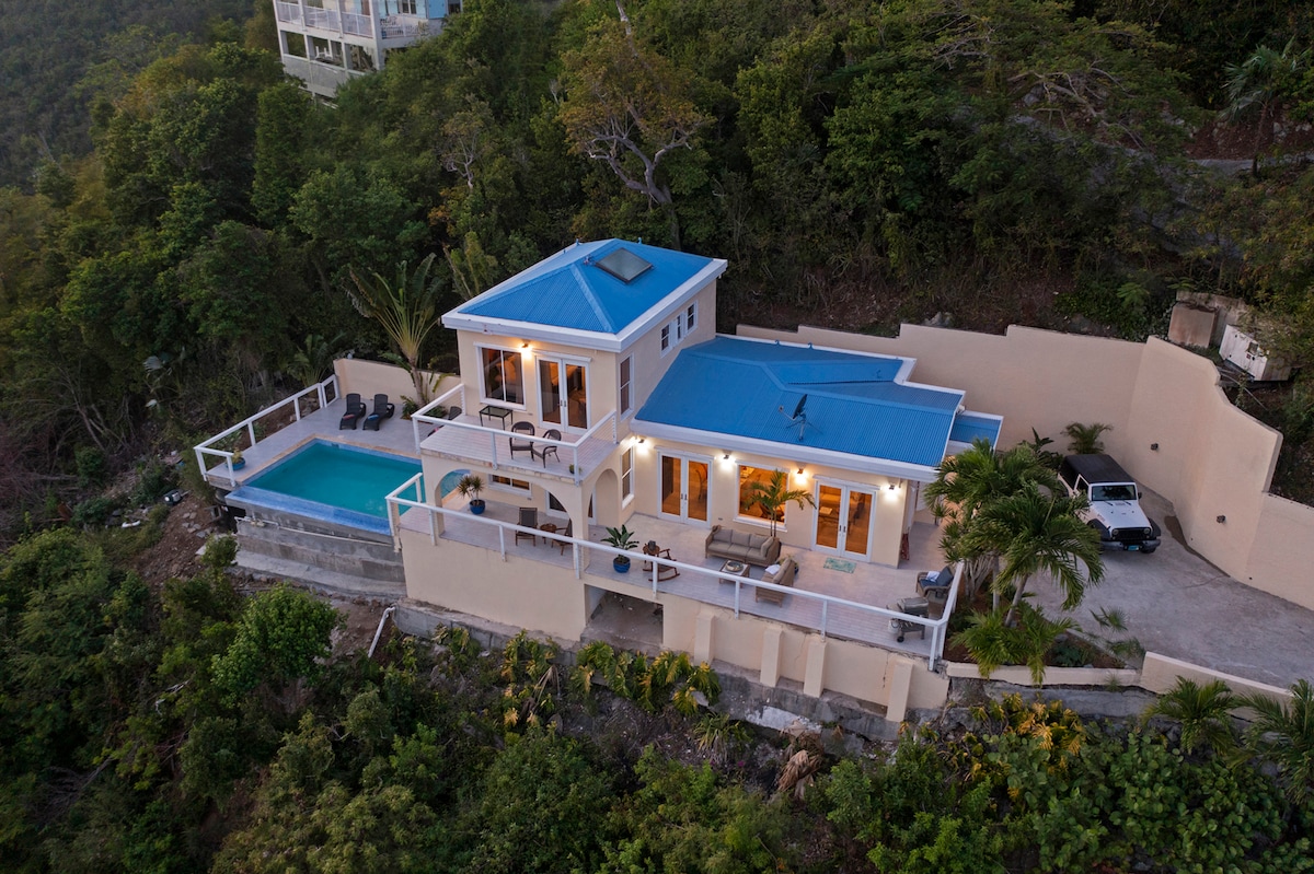 Preciosa casa de campo con 180 grados de vistas a las aguas blancas. Puedes ver y oír las olas rompiendo debajo. Aire acondicionado, privado, romántico con una hermosa ducha al aire libre. Acuéstate en un nido de intimidad. Sumérgete en las brisas de la isla. Disfruta de las vistas del sol naciente y la luna mientras brillan a través de las aguas cristalinas de Hurricane Hole. Adáptate al ritmo de la vida en la isla con energía solar y agua de lluvia purificada, recomendaciones ingeniosas, consejos y sugerencias de expertos. Bienvenido a la elegancia sencilla.