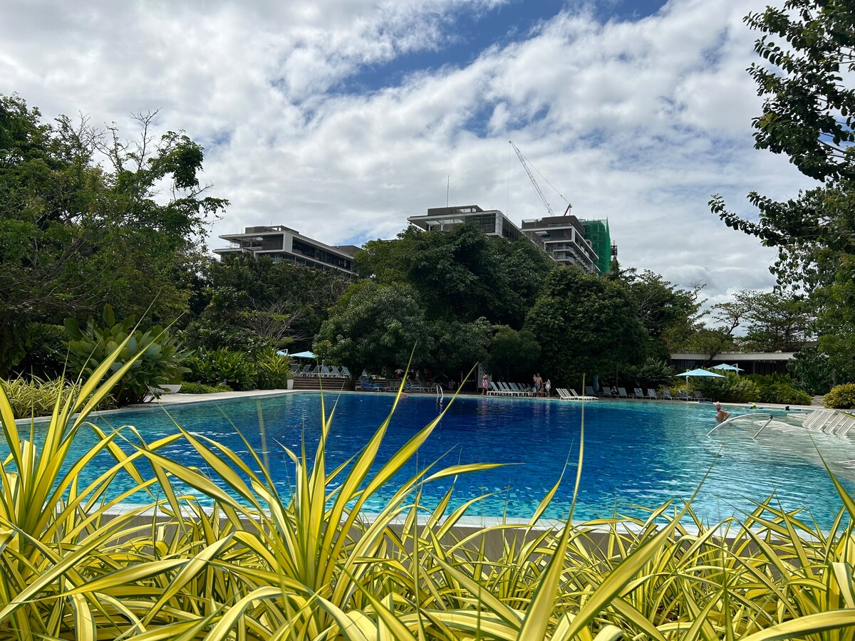 Olvídate de tus preocupaciones en este espacio espacioso y sereno Disfruta de una estancia encantadora en este elegante estudio con acceso al balcón, una piscina refrescante, wifi y una cocina totalmente equipada, que te da la libertad de cocinar y traer tus propias comidas para mayor comodidad. • Cama queen con cama nido • Acceso gratuito a la piscina para 2 personas y plaza de aparcamiento designada. • Fuentes ilimitadas de entretenimiento: Netflix, YT Premium, proyector 1080P, minikaraoke, juegos de mesa y de cartas. • Puedes cocinar y traer comida.
