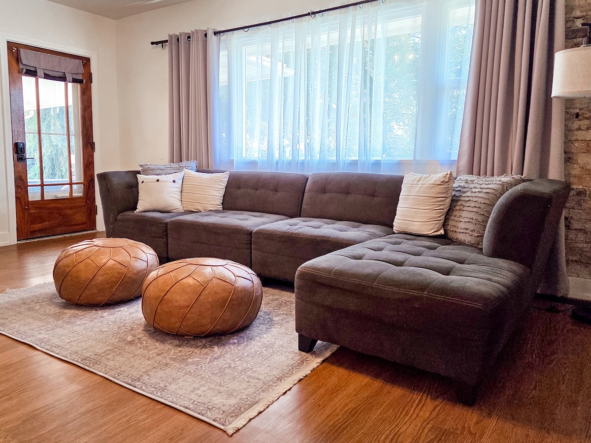Disfruta de películas en una pantalla de 65 pulgadas con altavoces envolventes. La cocina pequeña incluye nevera, microondas, horno tostador y mezcla para tortitas, ¡desayuno a tu antojo! Se proporcionan productos de papel, ya que el único lavabo está en el baño. Haz ejercicio en nuestro gimnasio compartido. 2 dormitorios: cama tamaño king y litera (doble, completa, con ruedas) y 1 baño. Acceso para huéspedes: Tendrás que caminar por la parte de atrás y bajar unos 20 escalones. Aspectos destacables: El espacio es el sótano de nuestra casa, por lo que es posible que nos escuches, ventiladores y ruido blanco. Solo 2 vehículos