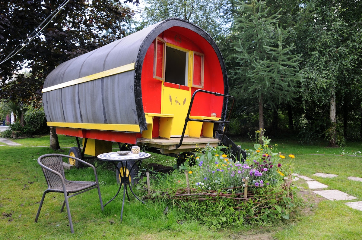 Glamping en auténticos carros de barriles de 70 años, restaurados para adaptarse a una pareja y (2 niños = 1 adulto). La forma redondeada iluminada por velas crea un cálido resplandor romántico. Toda la ropa de cama incluida, duchas calientes y aseos de fácil acceso en nuestro bloque de duchas o casa de camping. No hay espacio para la cama del bebé y no hay electricidad/inodoro en la caravana. Hay una cocina vegetariana de autoservicio/sala de estar comunitaria/área de trabajo con mesas y sofás cómodos. Ocasionalmente organizamos talleres de yoga, qigong, música o cocina vegetariana.