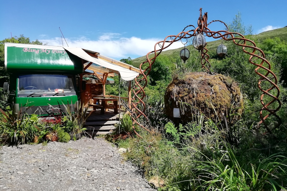 Sumérgete en el arte y la naturaleza en nuestro hermoso refugio natural. El camión, anteriormente conocido como Pinky, ahora se retira de festivales, eventos y viajes para que puedas disfrutar de una estancia en los hermosos alrededores de West Cork. El camión está enclavado en su propio jardín privado, con la interactiva «Hortisculptures Pod» para que te relajes. La tierra serpentea a través de bosques de hojas anchas hasta el río Coomhola, y está a solo unos kilómetros del Atlántico, debajo de las montañas de Cork y Kerry.