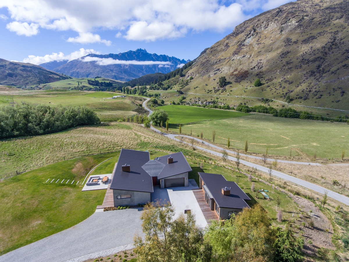Una nueva casa de campo en el hermoso Dalefield, en la base de Coronet Peak, a solo 2 km del campo de esquí. Riverstone Cottage se encuentra dentro de sus propios 6,5 acres con impresionantes vistas en todas las direcciones. Disfruta del acceso a través de un sendero privado al río Shotover, QT Trail y 165 acres de tierra DOC contigua con su propia red de senderos para practicar senderismo y ciclismo de montaña. Estarás rodeado de naturaleza, pero a solo 15 minutos en coche tanto de Queenstown como de la histórica Arrowtown. ¡Tenlo todo! :)
