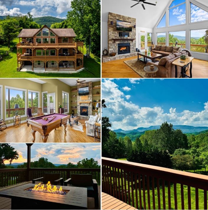 5700 pies cuadrados, vistas, sin caminos empinados, fogata, sala de juegos