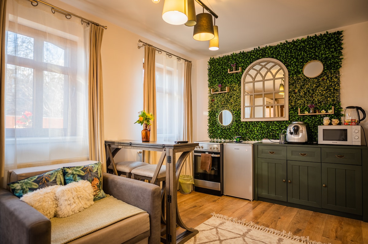 Disfruta de una estancia encantadora en nuestro lugar único. Ubicado en una zona privada tranquila y residencial, en la carretera a Poiana Brasov, estarás cerca del casco antiguo de Brasov (1,2 km) pero al mismo tiempo de camino a las pistas de esquí en Poiana Brasov (10 km). El estudio 14 incluye una sala de estar con una cama doble, un baño, una zona de cocina, un balcón privado y está equipado con todos los servicios que puedas necesitar para una estancia cómoda, como wifi y TV por cable.