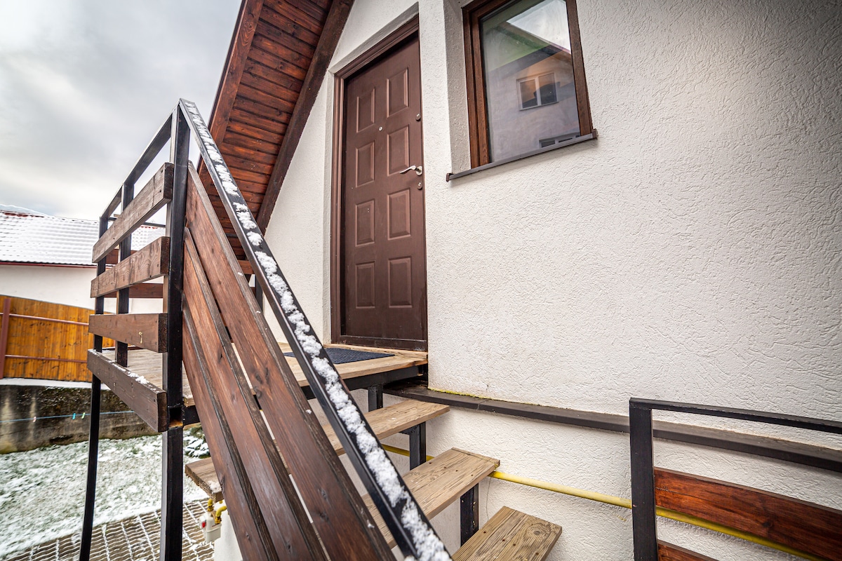 Enjoy a quiet, private stay in this attic studio in Vila 1 of Hanul Anei, perfect for couples or small families. The studio features a double bed, an expandable sofa bed for 2 guests, a fully equipped kitchen, a private bathroom, and a private terrace. From the attic window, enjoy beautiful mountain views while relaxing. Step out to the courtyard, park your car safely, and explore Brașov’s attractions. Optional outdoor Jacuzzi is available for your group (€40/day, must reserve 48h in advance).