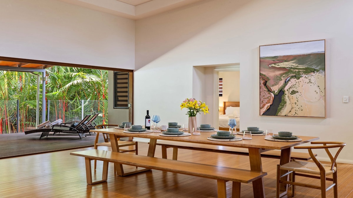 Indah is a spacious Balinese-inspired villa designed for multi-generational families or friends. Four bedrooms all have private ensuites, a 9m saltwater pool, and seamless indoor–outdoor living. Everyone has space to gather and space to retreat. Peaceful, private, and just minutes from Four Mile Beach and Macrossan Street, Indah offers relaxed tropical escapes with room to spread out and enjoy.