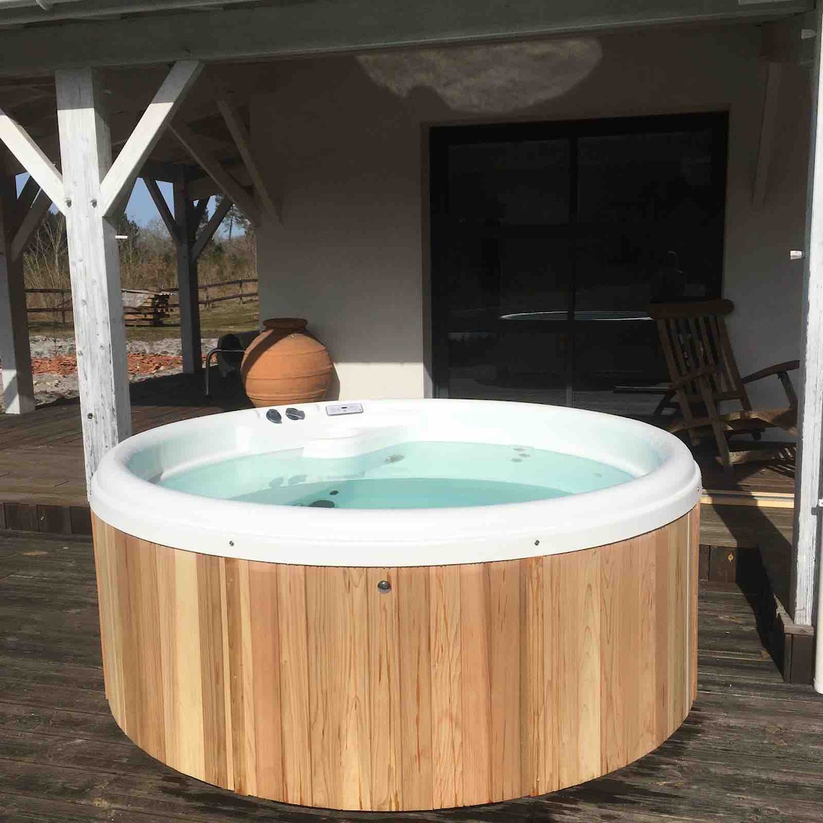 Relájese en este alojamiento atípico, único y tranquilo en el corazón del bosque de las Landas. Disfrutarás de la comodidad y la serenidad de este chalé de troncos en un ambiente refinado. Venga a disfrutar del encanto, la comodidad y la magia de la madera. Un mobiliario de jardín original te permitirá disfrutar de la cocina al aire libre de otra época. Este momento de convivencia se puede prolongar con una partida de bolos, petanca en la bolera iluminada o un momento de relajación en el jacuzzi