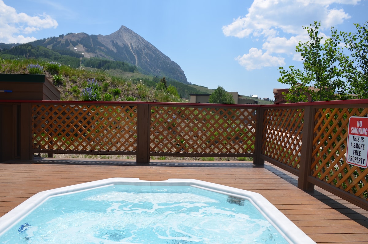 Esta unidad de esquina de dos pisos, dos dormitorios y dos baños tiene capacidad para 6 personas y se siente más como un hogar que una casa adosada o condominio. El espacio privado ofrece hermosas vistas orientadas al oeste hacia la ciudad de Crested Butte, Oh Be Joyful Range, Mount Emmons y Red Lady Bowl. Enormes ventanales, una terraza bañada por el sol con sillas de esquí Adirondack hechas a mano en verano y otoño, un césped privado y una acogedora chimenea de gas: el lugar perfecto para el après ski con amigos y familiares. Los atardeceres son espectaculares.
