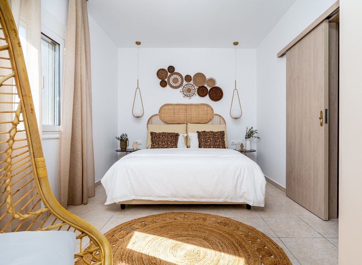 Este estudio de lujo recientemente renovado con impresionantes vistas panorámicas al mar y al atardecer se encuentra en la cima de una pequeña colina en un barrio tranquilo, con aparcamiento gratuito en la calle. El casco antiguo está a 12 minutos a pie. Cuenta con un espacio abierto (dormitorio - cocina) y un baño de 27 m². Se le permite utilizar todas las instalaciones del hotel de lujo adyacente MACARIS SUITES & SPA pidiendo comida o bebida.
