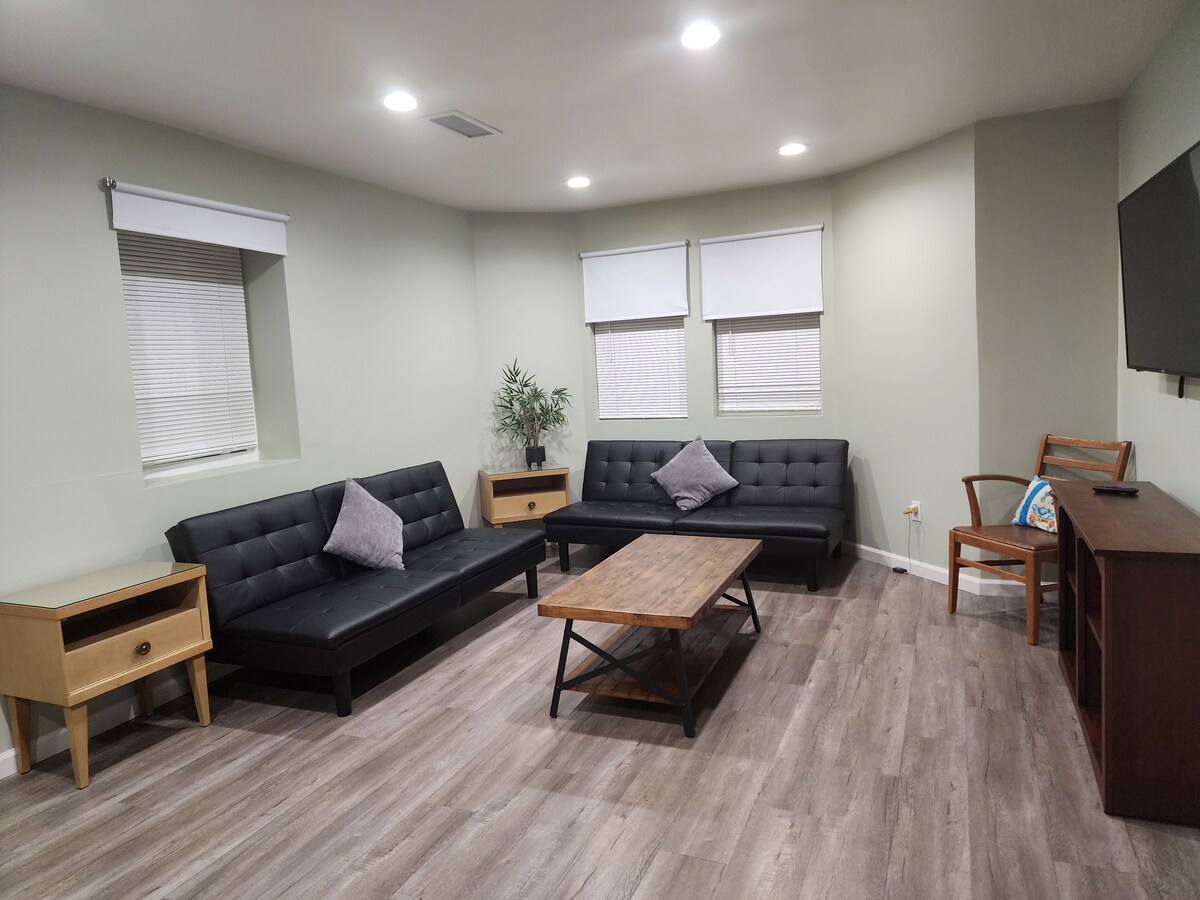 Ven y disfruta de esta unidad de 1 dormitorio. Un dormitorio acogedor y luminoso con una cómoda cama tamaño queen. El salón consta de un comedor dedicado y una zona de relax con sofá y TV. La cocina pequeña incluye microondas, horno pequeño y cafetera K-Cup, pero no HORNO. Calefacción y aire acondicionado recién instalados. Esta suite forma parte de una casa unifamiliar. El resto de la casa también se alquila como unidad de Airbnb, pero con entrada independiente. El área de la terraza es compartida. La entrada está en el patio trasero.