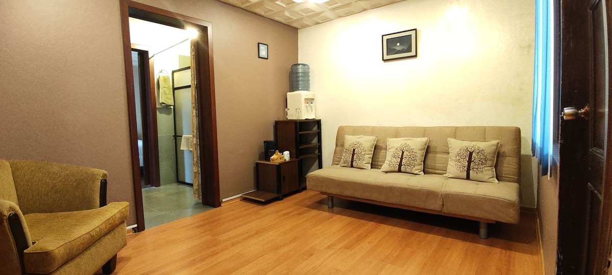 Esta habitación tiene mucho espacio un área de hall con sofa cama, café y te, dispensador de agua. Tiene un sofá cama de plaza y media para acoger a una persona más. Ubicada cerca de centros comerciales, bares, restaurantes y cafés. Incluye amenidades de primera necesidad (shampoo, jabón líquido) El barrio es muy seguro a 10 min a pie del museo del Banco Central, parque de la madre, Puente Roto y Casa del Herrero y Estadio Hospitales y clínicas muy cercanas a solo 5 min a pie.